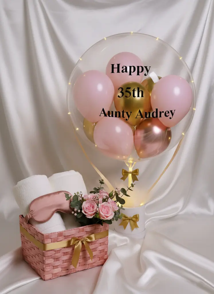 At the heart of this arrangement is a large transparent balloon that floats gracefully above the bucket. Inside, it contains 7–8 smaller balloons with specified colours, creating a playful and charming effect that immediately draws attention. The clear outer balloon enhances the layered look, allowing the mini balloons to appear as if they are gently floating in mid-air. This whimsical detail makes the balloon bucket both elegant and fun, suitable for recipients of all ages. The customisable texts on the balloon is great for expressing your greeting or love. The balloon will last for one or two weeks.